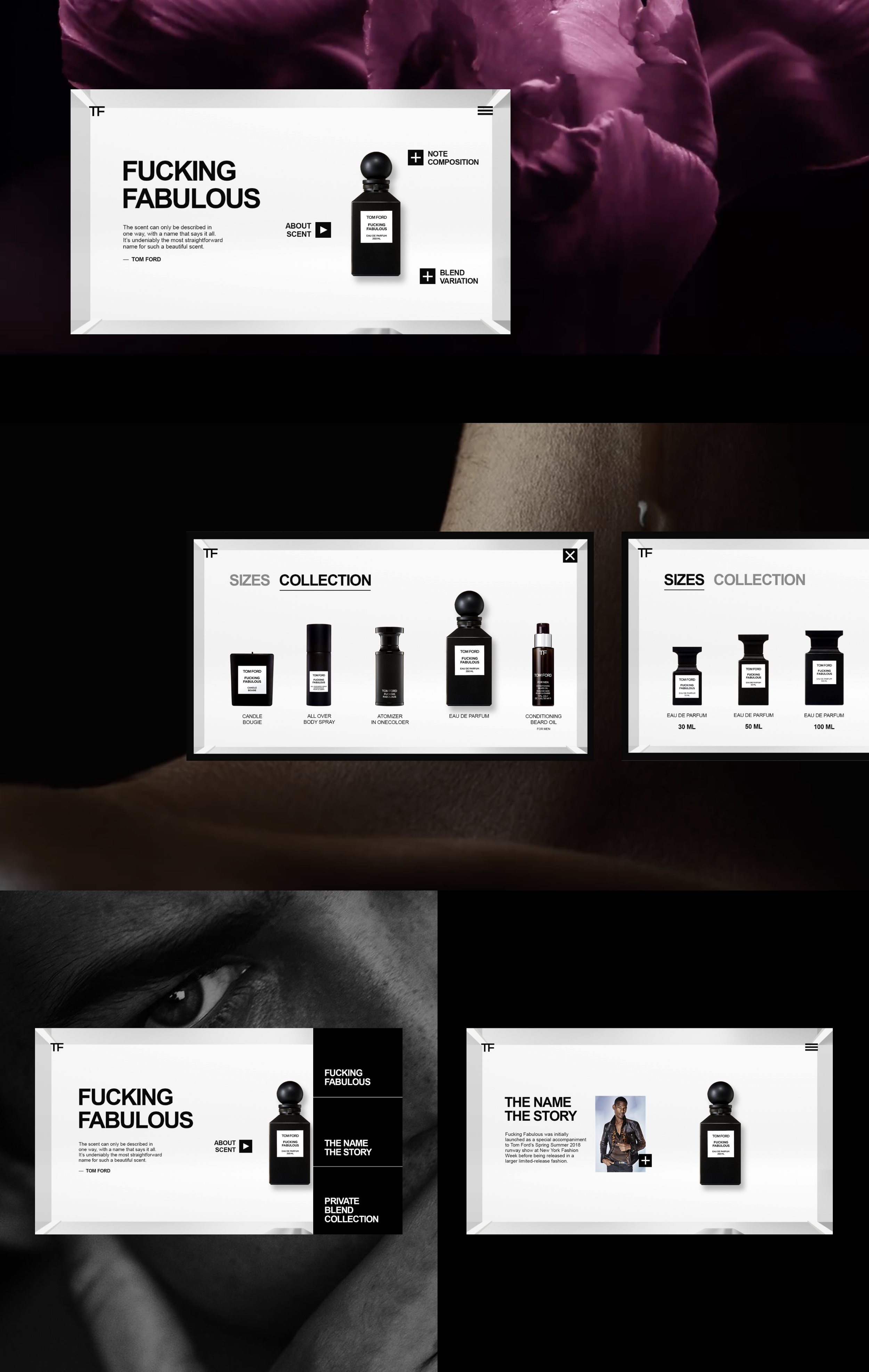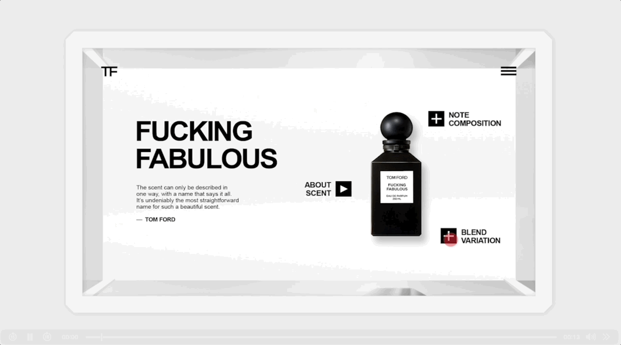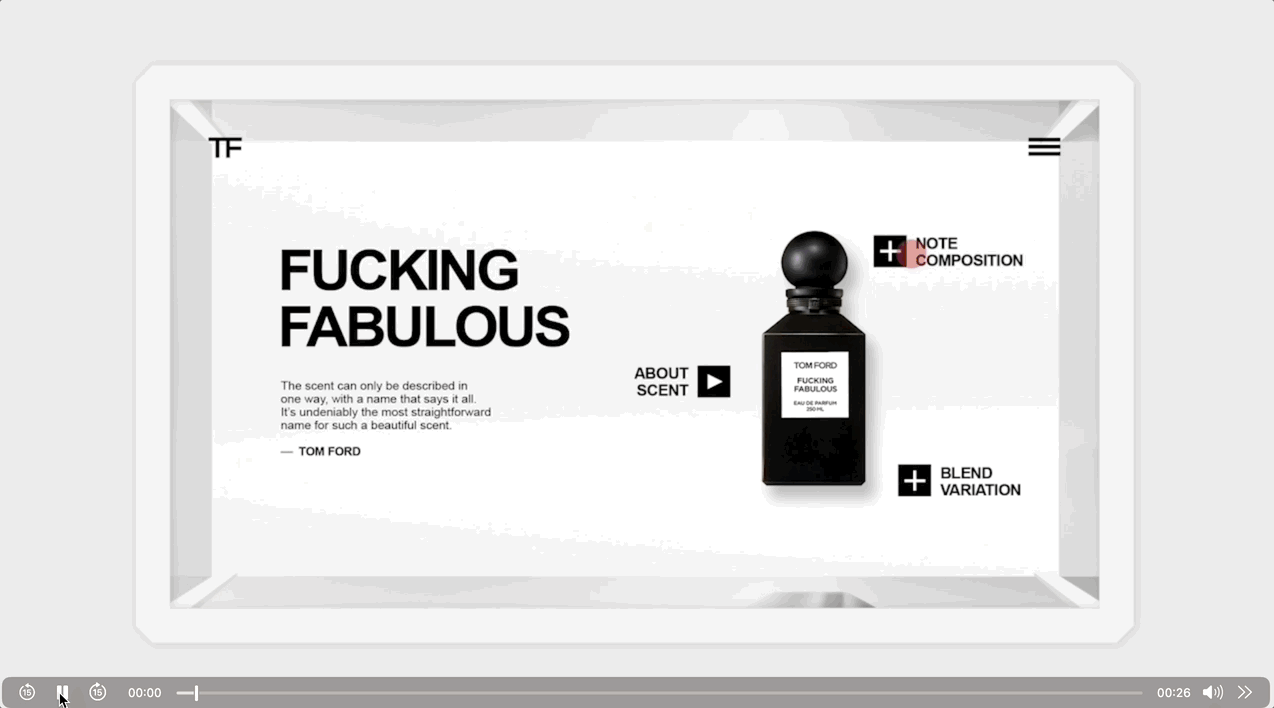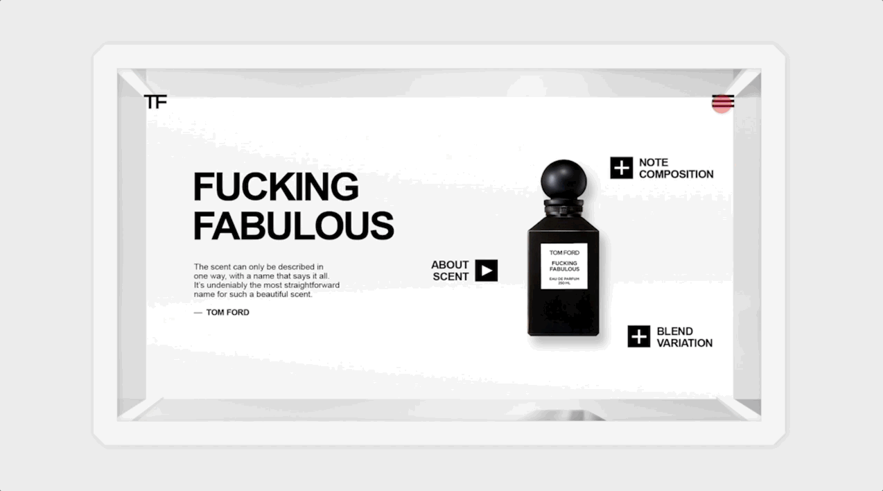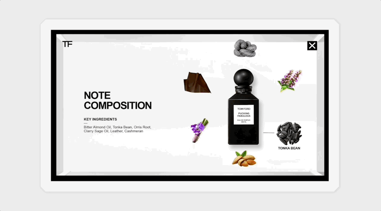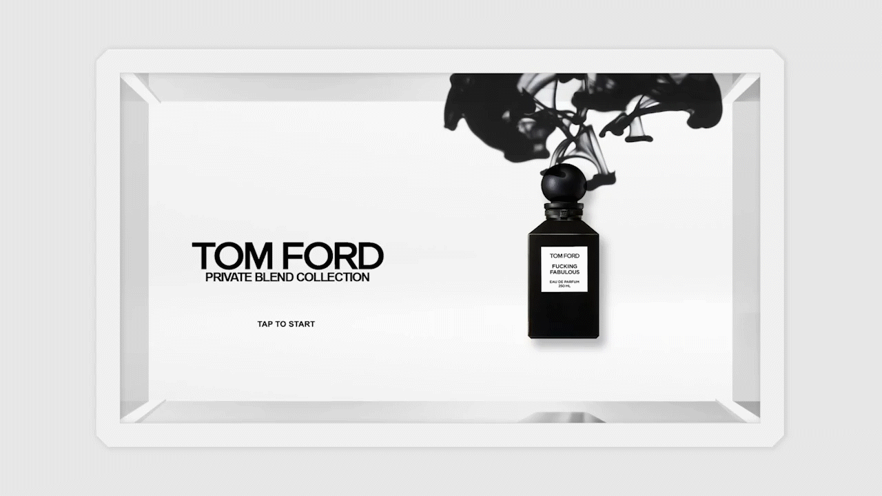 I designed the interactive screen UI showcasing fragrance notes, bottle sizes, and collections—brought to life through sequential designs and motion prototypes that demonstrate how customers engage with the Tom Ford experience in-store.